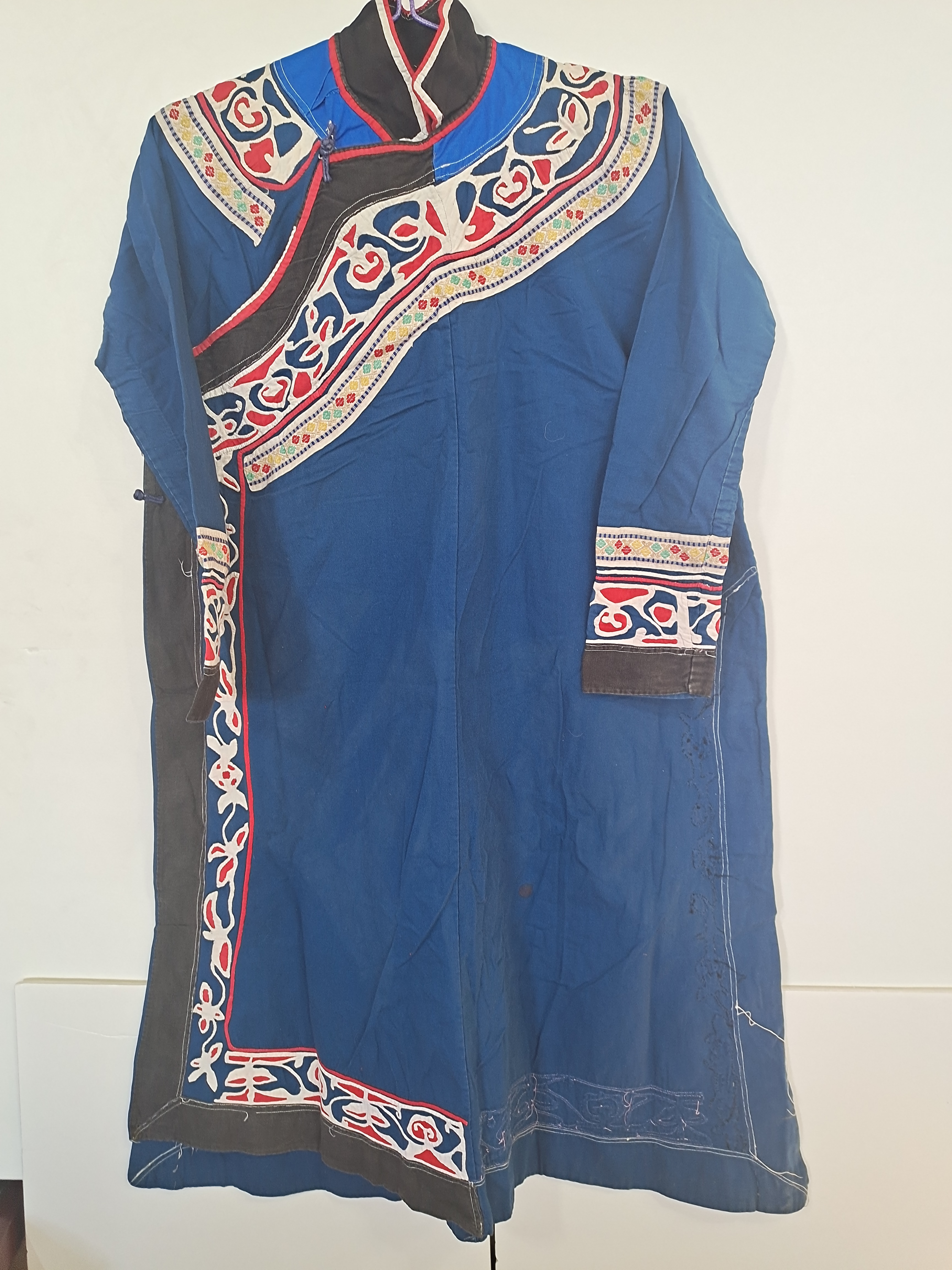 女式圆领右开襟蓝底大宽滚边剪贴对称卷草图案长衫